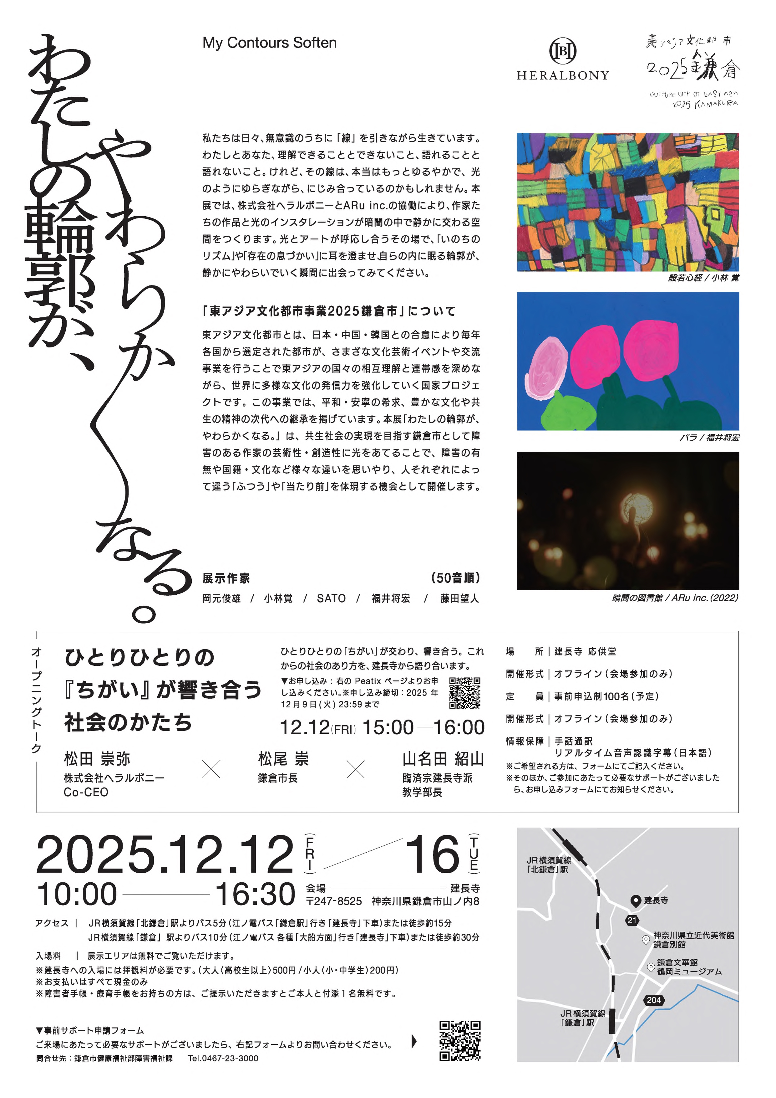東アジア文化都市とは、日本・中国・韓国との合意により毎年各国から選定された都市が、さまざな文化芸術イベントや交流事業を行うことで東アジアの国々の相互理解と連帯感を深めながら、世界に多様な文化の発信力を強化していく国家プロジェクトです。この事業では、平和・安寧の希求、豊かな文化や共生の精神の次代への継承を掲げています。本展「わたしの輪郭が、やわらかくなる。」は、共生社会の実現を目指す鎌倉市として障害のある作家の芸術性・創造性に光をあてることで、障害の有無や国籍・文化など様々な違いを思いやり、人それぞれによって違う「ふつう」や「当たり前」を体現する機会として開催します。