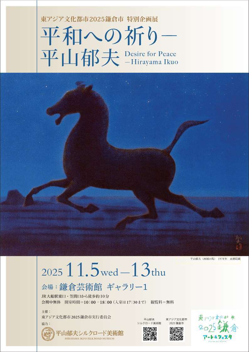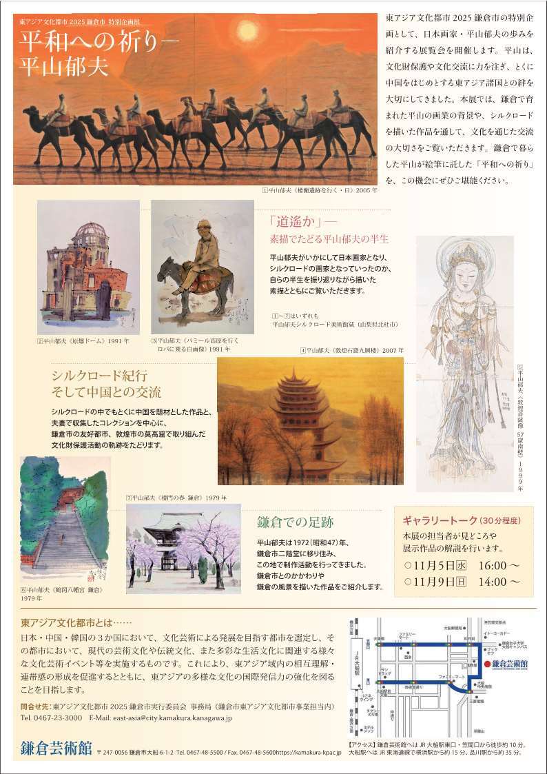 東アジア文化都市2025鎌倉市の特別企画として、日本画家・平山郁夫の歩みを紹介する展覧会を開催します。平山氏は、文化財保護や文化交流に力を注ぎ、とくに中国をはじめとする東アジア諸国との絆を大切にしてきました。本展では、鎌倉で育まれた平山氏の画業の背景や、シルクロードを描いた作品を通して、文化を通じた交流の大切さをご覧いただきます。鎌倉で暮らした平山氏が絵筆に託した「平和への祈り」を、この機会にぜひご堪能ください。